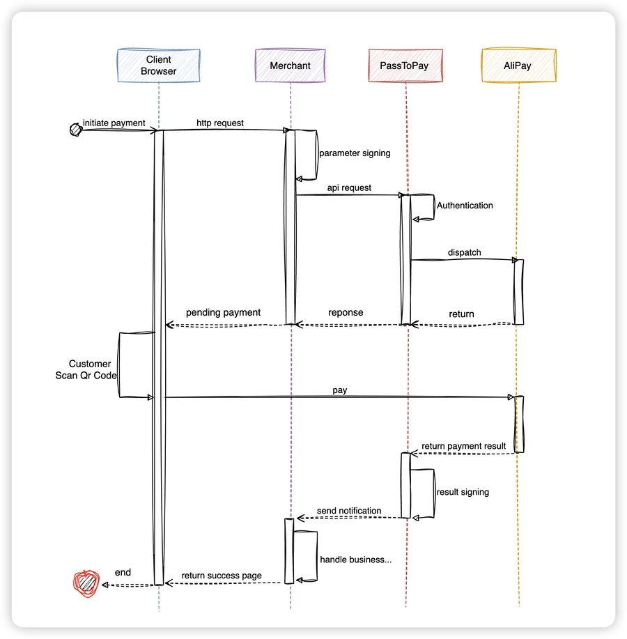 下圖以客戶使用支付寶掃碼支付為例,展示各個系統之間的交互流程: